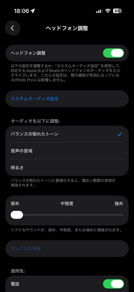[アクセシビリティ > オーディオ/ビジュアル > ヘッドフォン調整]