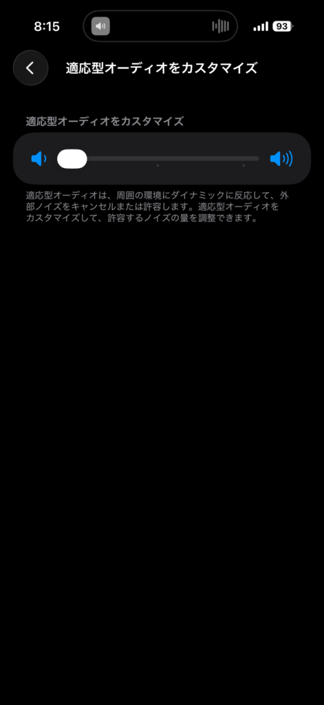 まずこの存在自体知らずに買ってるなんでApple好きからしたら意味分かんないかもなんですが、なんだろこれと思って使ってみると、最初は「ん?外音取り込みと一緒?ノイキャン聞いてる?中途半端な機能かな?」と思っていましたが、これが便利。歩いているときは外部音を少し取り込み、騒がしい場所に行くと自動でノイキャンが強くなる。