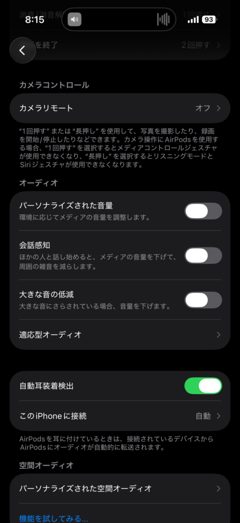 ※ちなみに空間オーディオという設定もあり、これはこれでライブ動画とか見る分にはいいかもって思ったんですが、自分はスタジオ録音の曲をソリッドに聞くのが好きなので、特に触れません。電池持ちもわるくなるらしいし。でも、悪くはなさそうです!
